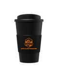 Double walled insulated take away cup with 350ml capacity. It features a screw-on safety lid and a colorful silicone grip. The glass is completely recyclable and packaged in a compostable bag.
